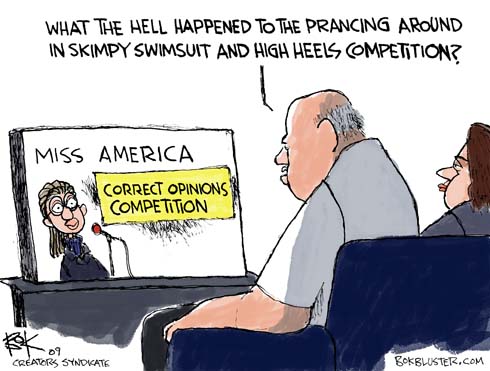 Here’s a You Tube video of Miss California being asked a question about gay marriage by high profile gay guy, Perez Hilton. It’s possible Miss Prejean’s answer cost her the crown. The next day Judge Hilton called her a “dumb bitch”. The Guardian has a good story about the affair. The president is also opposed to gay marriage. Wonder if Hilton thinks he’s a dumb bitch too?