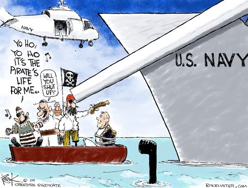 Well, when I drew this it looked like we had the drop on the pirates. Our pirate hostage hero, Master and Commander, Richard Phillips, jumped overboard and swam for the navy destroyer, USS Bainbridge. Information is sketchy but it seemed like a good opportunity for shooting pirates in a barrel. Instead the pirates recaptured the bold Commander. Safety seems to be the operative word here. A New York Times report says, “the captain was seen “safe and sound” back on board the lifeboat…” Doesn’t appear to be what the captain had in mind.